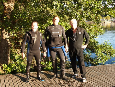 Le vacanze stanno per finire, ma la Veja Crica non molla e vista la bellissima giornata, domenica 24 agosto, con un giro di telefonate ci si ritrova in tre sul pontile CSC al Lago Sirio. C'e' molto traffico di bagnanti, si aspetta quindi di trovare un buco e verso le 18 riusciamo finalmente a posizionarci e a prepararci per il tuffo. Fa' molto caldo (30 gradi) ma sappiamo che la' sotto la temperatura sarà molto più fresca, io e Paolo decidiamo per la stagna, Gianni vuole tentare con la "umida". Ci buttiamo, blurp! nei primi 10 metri di discesa la visibilità e' ridotta a pochi centimetri, ma al cambio di temperatura (si passa da 23 gradi a 7 gradi) tutto diventa più limpido e accese le nostre torce iniziamo il giro puntando verso la prima macchina. Con molta sorpresa, a -27 metri la visibilità cambia nuovamente in peggio e ci vediamo costretti a rinunciare alla ricerca della Fiat-500 più profonda. Ci dirigiamo quindi sulla seconda macchina, Gianni comincia a sentir freddo e si stacca da noi puntando verso una zona più calda, arriviamo alla seconda 500 in un attimo, un giro intorno e poi puntiamo verso la Lancia Giulia poco piu' avanti. Ritorniamo quindi al punto di partenza tenendoci ad un aprofondità di 12 metri fino a ritrovare la catena del pontile. Risalita e sosta di sicurezza a 3 metri, poi uscita.... Gianni ancora non si vede, preoccupati cerchiamo le bolle, lo vediamo, è sotto il pontile alla ricerca di qualche souvenir perso dai "bagnanti". Con calma e con l'aiuto di Katia e Maria, ritiriamo le attrezzature, rispondiamo alle domande degli "spettatori" e poi la solita foto di gruppo. Sono le 19.30, lo stomaco inizia a brontolare, ok, decidiamo per una pizza nel ristorante Il Sole poco più avanti. La giornata termina con una lunga chiacchierata e la firma sui log-book e ci si accorda per il prossimo tuffo.... :-)